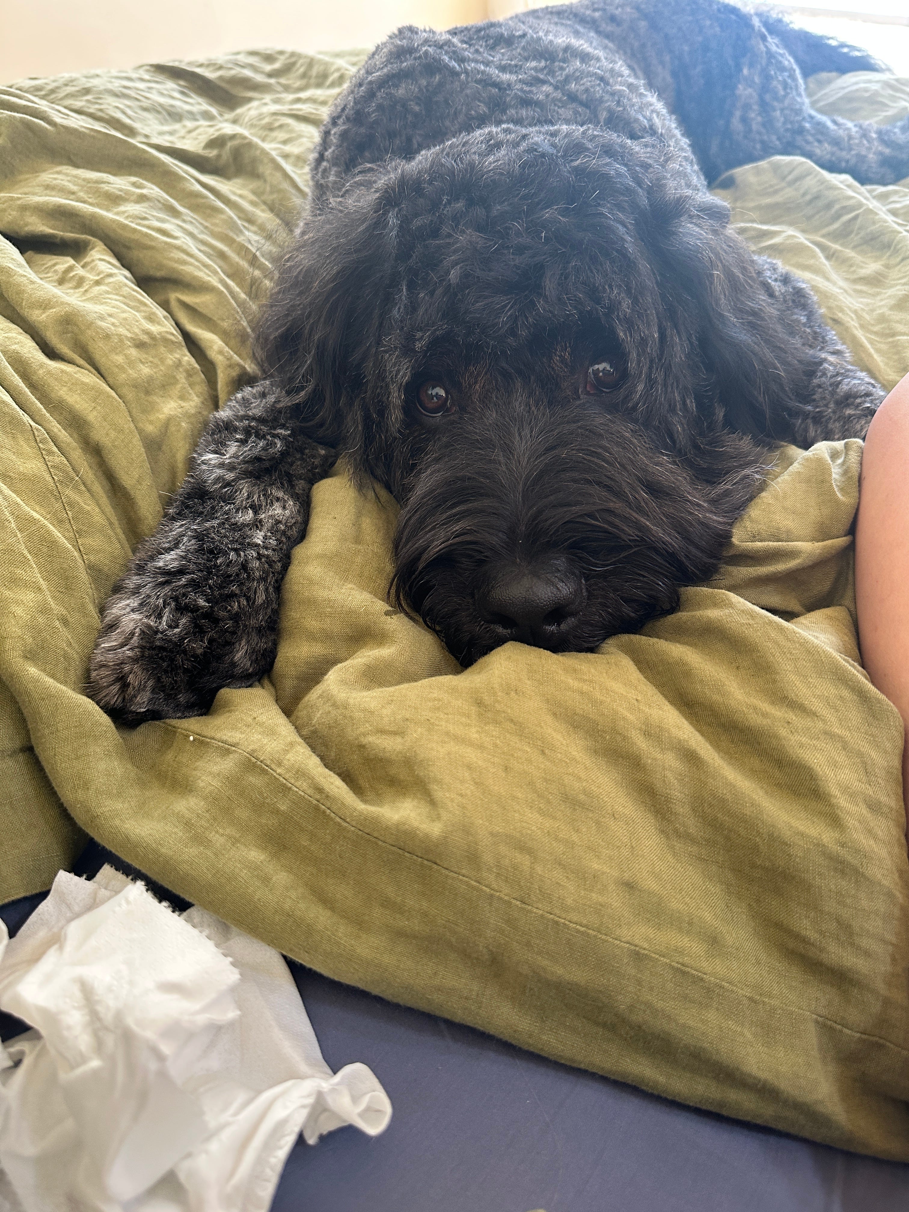 Alright folks, it’s nap time for me again. I’ll leave you with this real-time photo of Leonard, who has been stealing my used tissues at every opportunity. I call this photo, “an exercise of restraint.”