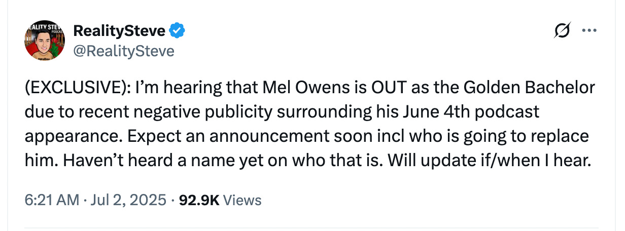 Sticking to reality TV, juicy news in Golden Bachelor world…apparently, rumor has it that only weeks out from the beginning of production, their slated lead is out. Mel Owens was announced as the new lead of Golden Bach back in April along with the show’s renewal, but has reportedly been sacked after some off-putting comments on the In the Trenches podcast — which is like, for University of Michigan football? I get he’s a retired football player, but what are we doing on this podcast? Where’s the PR manager?! He said things like, “they asked me, 'what's your preferences?' So, I just said 45 to 60, just being honest. And then the process went, and I was selected, right? And then we had lunch with the executive producer. I said, 'you know, if they're 60 or over, I'm cutting them.'“ Uhhhhhh….the show (almost) exclusively casts contestants over 60? That’s…kinda the point of the show? He also allegedly made some comments about not wanting “wigs” or any fake hips. Cooool cool cool. As the Bachelor team has notoriously made horrendous decisions the past few years when it comes to protecting any of their leads or contestants, I’m both shocked and thrilled he got the boot. Give these ladies a nice man! Fingers crossed an official announcement is headed our way.
