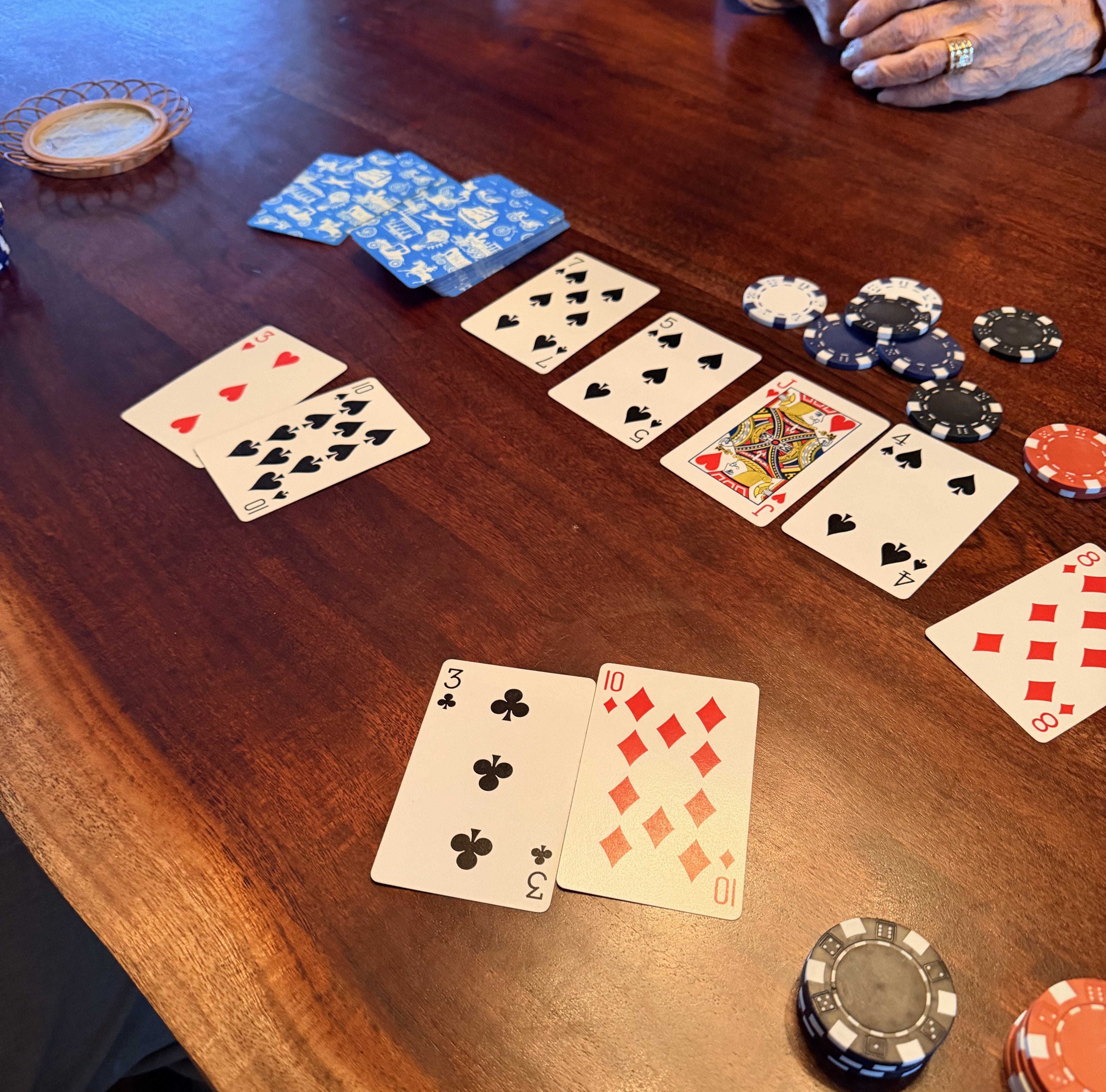 We had an afternoon of card games with my in-laws this past Sunday — I lost Scat and ended up in a head-to-head with Sam as we closed out rounds of poker (I won, but he gave it to me). Most notably, in one of our final rounds against each other, we ended up with the exact same hand in Texas Hold ‘Em, which was kind of unbelievable.