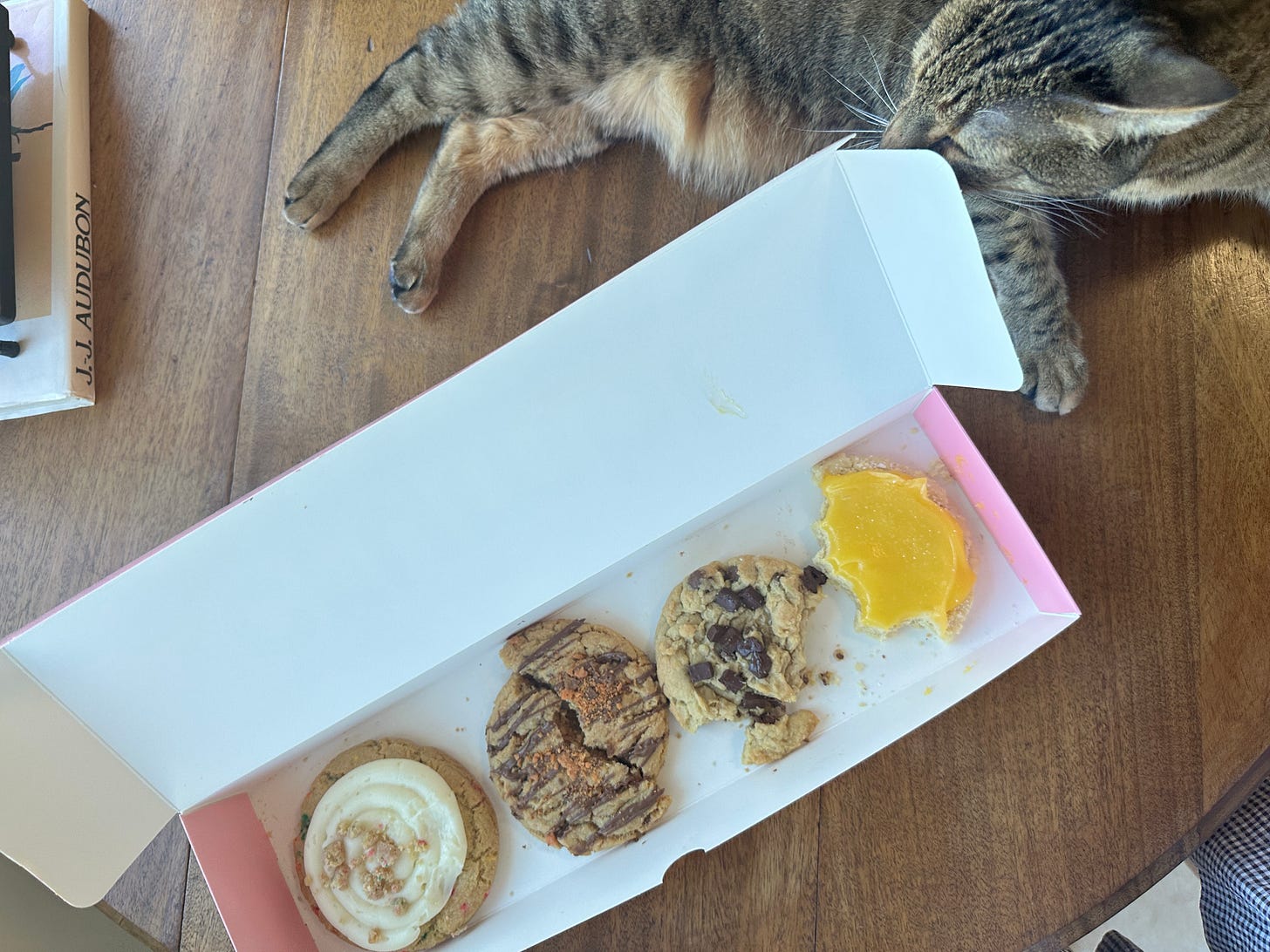 Had my first — yes, my very first believe it or not — Crumbl cookies on Tuesday. Sam was sending some to a client through his work and couldn’t stop talking about them, so I, a very generous wife, drove the extra 20 minutes after both a Home Depot and a Costco run to get us a box. Some might call me a hero. Having assumed them to be highly overrated, they actually were really good. The Lemon Bar one was my personal fave.
